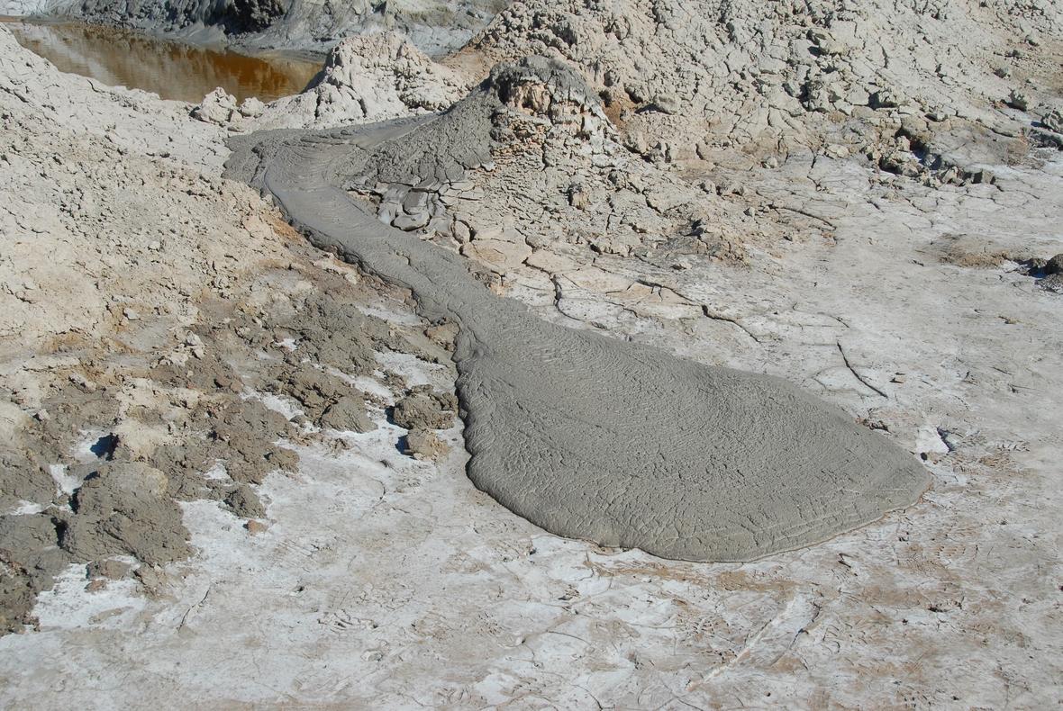 Mud flows as a mud volcano erupts in the Salton Sea in California.