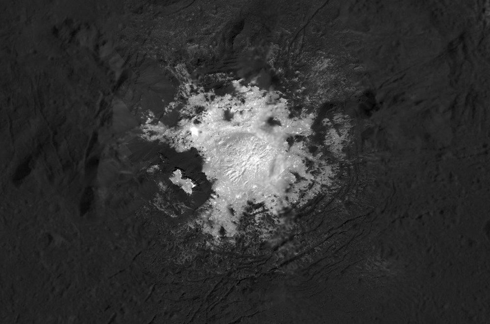 A close-up image of some of the bright spots in Occator Crater.