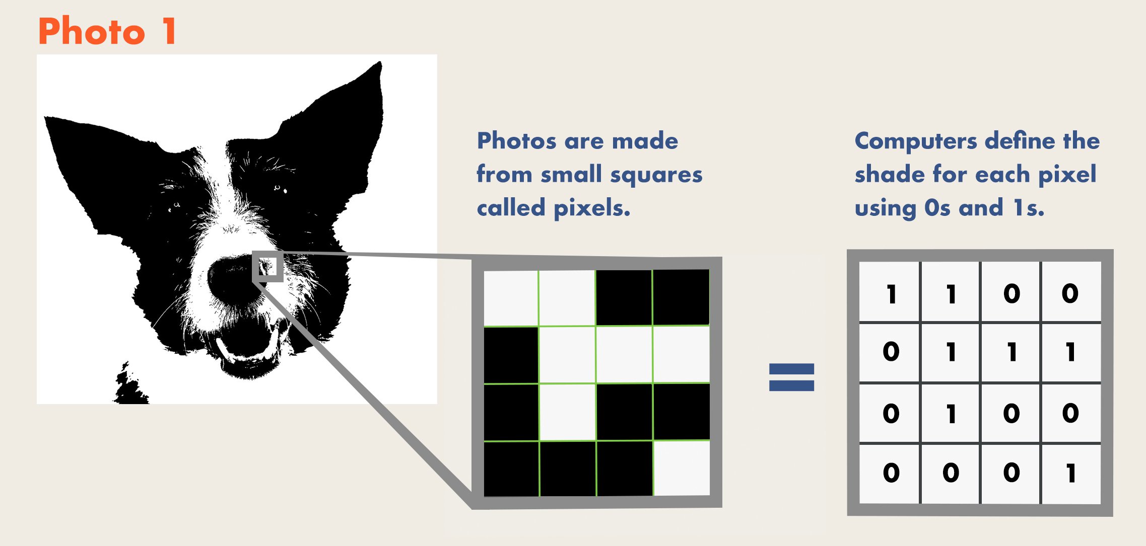 As you saw in the activity on page 2, computer code consists of only 0s and 1s. In the computer code on the right, each digit defines the color of a pixel in the photo. In this case, there are two colors: black and white. If computer code contains only 0s and 1s, how can a computer define more colors?