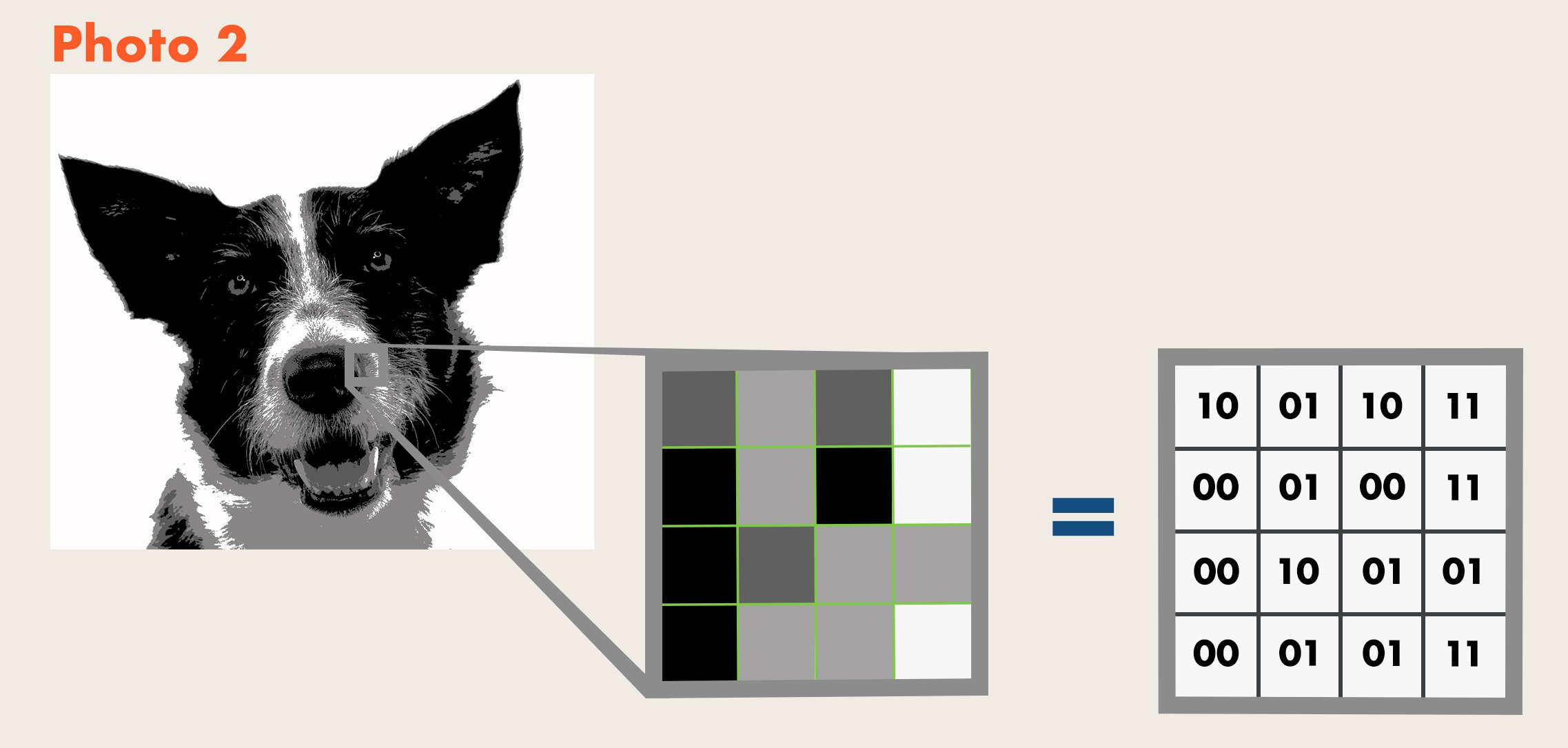 Two bits define each pixel in Photo 2. Here, a pair of numbers defines the color—or, in this case, shade of gray—of each pixel. In Photo 2, there are four possible shades of gray because there are four possible combinations of 0s and 1s. Notice how the code to the right of the image relates to the colors of each pixel.