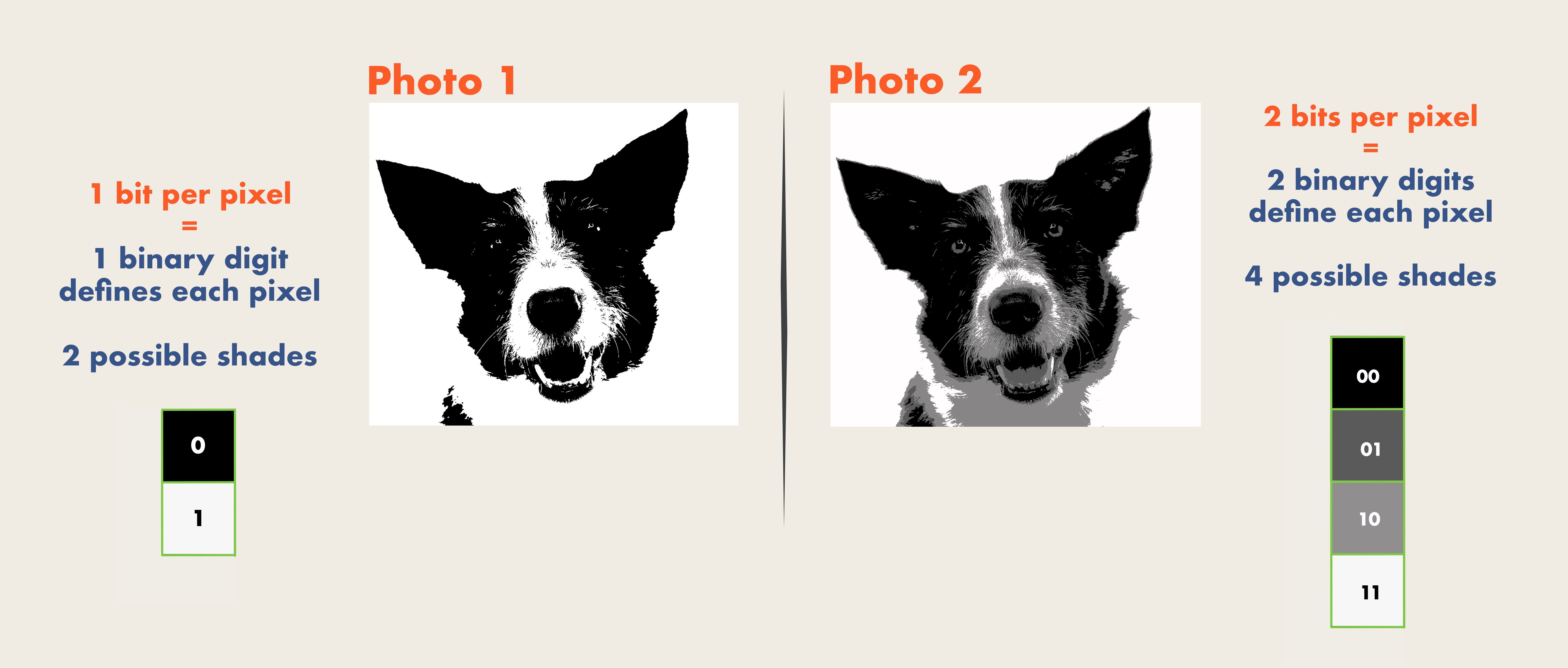 In the photos on the right, what details can you see when there are 2 bits per pixel that you cannot see when there is 1 bit per pixel?