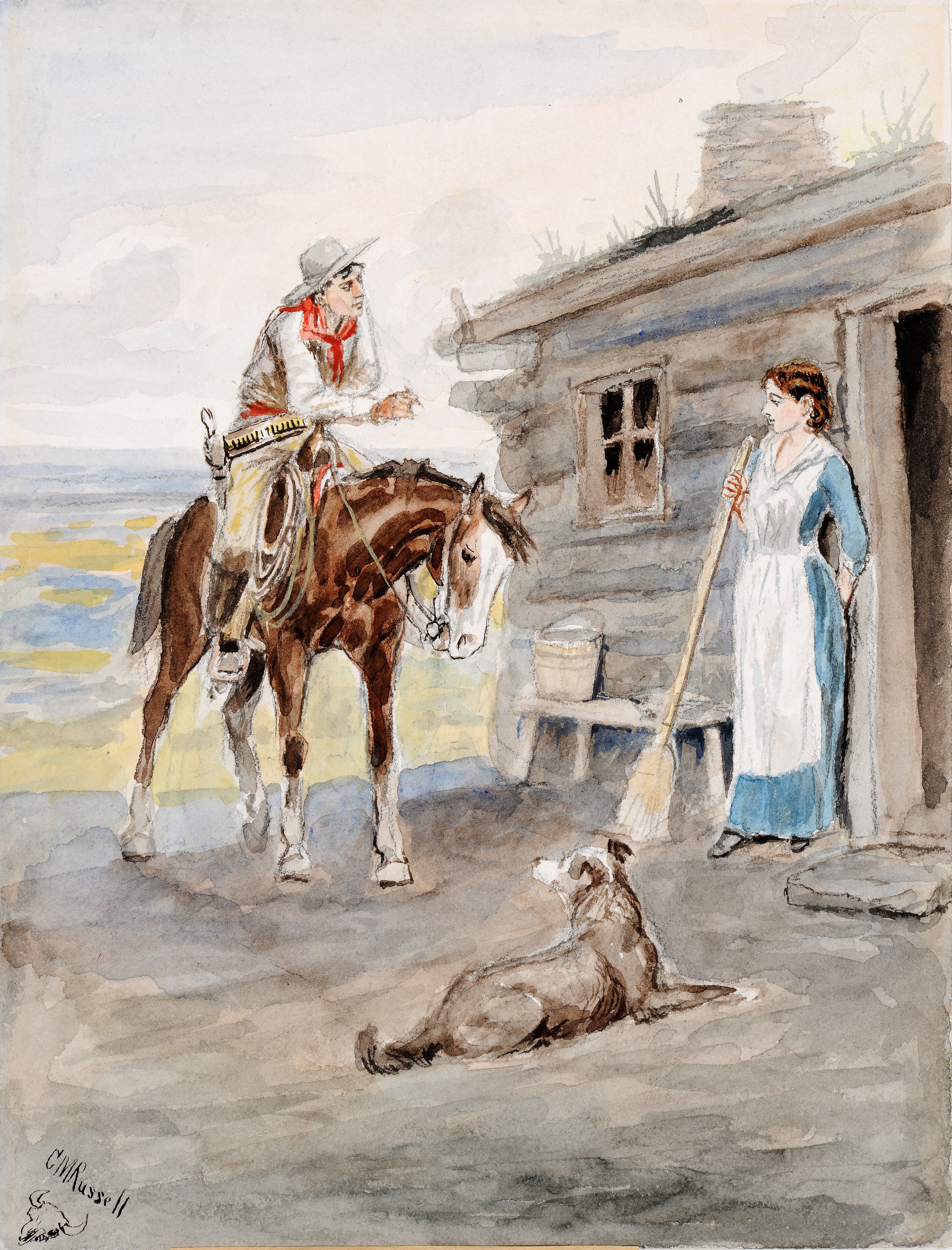 In this piece, a young woman shyly visits with a cowboy who has ridden up to the doorstep of her log-cabin home on the plains.