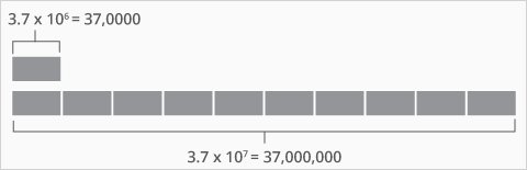 The population of California is about 3.7 x 107 and the population of Oklahoma is about 3.7 x 106. How much larger is California’s population?