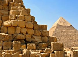 The pyramids are huge: the largest one is the Great Pyramid of the pharaoh Khufu. It contains 2.5 million stone blocks, weighs over six million tons, and is as tall as a 40-story skyscraper.