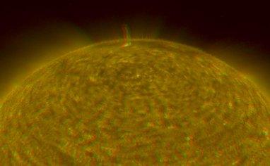 This image of the Sun is a composite of color image pairs taken by the SECCHI Extreme UltraViolet Imager (EUVI) mounted on the STEREO-B and STEREO-A spacecraft.