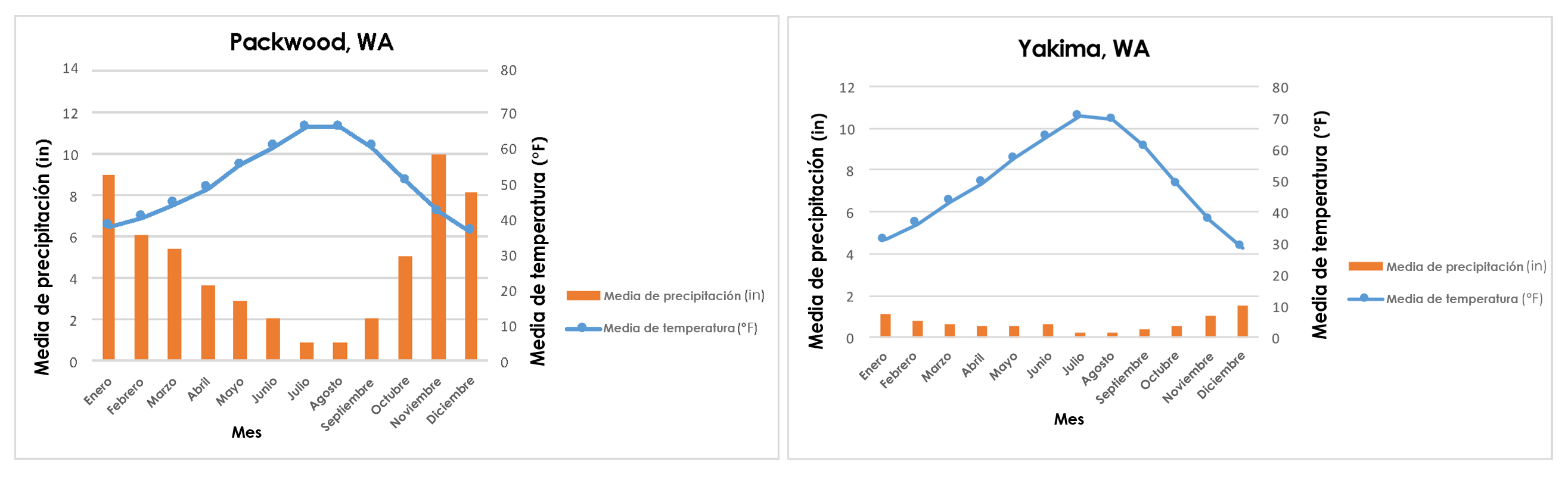 Explica las diferencias climatológicas (según la temperatura y la precipitación) de Yakima y Packwood a cada lado de la Cordillera Cascada. Usa evidencia de la imagen satelital y las gráficas para apoyar tu respuesta.